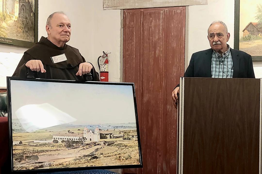 Father Jack Clark Robinson, OFM Executive Director of SBMAL displays historic Mission DeLise colorized photo donated to the SB Mission Archive-Library during rhe Q&A. Father Jack Clark Robinson, OFM Executive Director of SBMAL, who moderated the afternoon lecture, displayed a stunning Joe De Lise colorized photo of the historic Old Santa Barbara Mission that was donated to the Mission for display in the SBMAL collection. Father Jack also shared the upcoming series schedule for events through August 2026, which will include a presentation by Joan Coda, who will share details on two decades of behind-the-scenes stories relating to the Old Santa Barbara Mission Gift Shop.