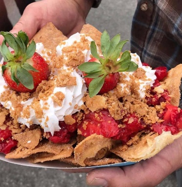Strawberry Nachos Strawberries Take Center Stage At 40th Annual California Strawberry Festival, May 16 and 17 For strawberry lovers, the 40th Annual California Strawberry Festival, May 16 and 17 at the Ventura County Fairgrounds (10 W. Harbor Blvd., Ventura, CA 93001), is the place to be. Festivalgoers can indulge in such treats as chocolate-covered strawberries, strawberry-topped funnel cakes, strawberry pizza, strawberry nachos, deep-fried strawberries, strawberry tacos and strawberry beer, margaritas and smoothies. Among the unique strawberry-themed desserts at Mama Carol’s Kitchen booth are sweet strawberry nachos, sweet strawberry tamales (featured in Woman’s Day magazine), Dubia chocolate and strawberry cups, and strawberry beignets. Carol Maldonado, owner of Mama Carol’s Kitchen, has been selling her creations at the festival for over 25 years. “Our beignets were our biggest sellers last year,” says Maldonado, who has her family help out in her booth at the festival. “It’s always been a family event. We have regulars who stop by every year. We love to see so many happy people and reconnect.”  The Kabob Shack offers a combination of strawberry, banana and brownie kabobs, drizzled with milk and white chocolate. Over the course of the festival weekend, Kabob Shack goes through more than 100 pounds of chocolate and about 140 flats of fresh strawberries. “My favorite part of the California Strawberry Festival is seeing the smiles and excitement when I hand someone one of our treats,” says Kabob Shack owner Stacia Mizukawa. “It means everything.” Another festival favorite is the chocolate-dipped strawberries from the Oxnard Buddhist Temple. Two shifts of 30 volunteers dip giant strawberries into melted Merkins chocolate. They then put the strawberries in cupcake holders and set them on racks to cool. The strawberries are sold individually and in three- and six-packs. The booth sells about 20,000 chocolate-dipped strawberries over the two-day festival. Festival hours are 10:00 a.m. to 6:30 p.m. both days. General admission is $15, active military with ID and family and seniors 62 and over, $10, youth ages 5 to 12, $8, and children 4 and under are free. Tickets can be purchased in advance at www.CAStrawberryFestival.org or at the festival. A limited amount of parking is available onsite for $30 per vehicle. Festival-goers are encouraged to use the free shuttles, which will run every 15 minutes to the festival from nearby locations in Oxnard and Ventura. Metrolink and Amtrak’s Surfliner make regular stops throughout the festival weekend with discounted fares. The train station is located steps from the fairgrounds. For more about the festival, visit www.castrawberryfestival.org or follow the festival on Facebook and Instagram. ♦ ♦ ♦