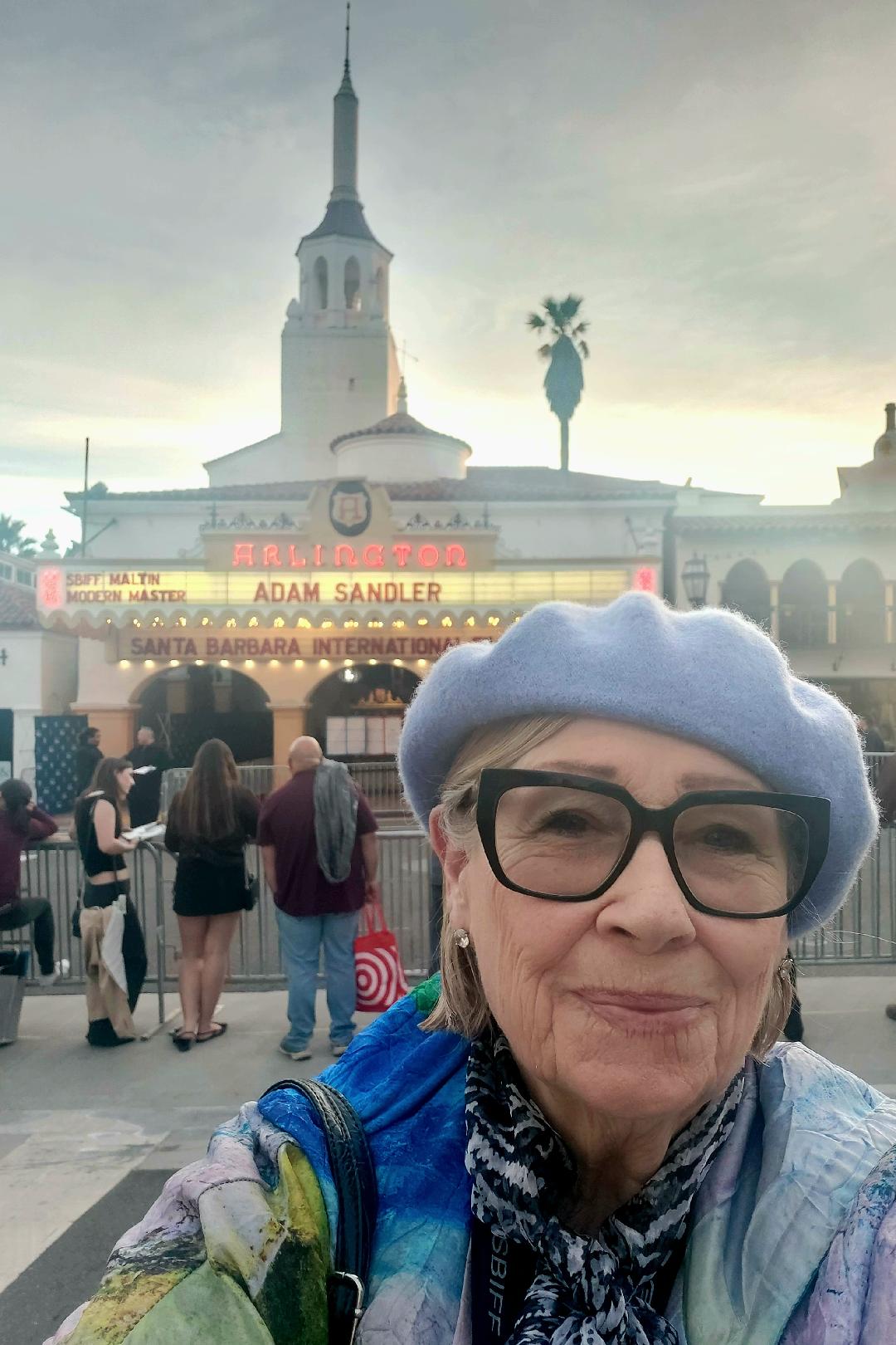 OPENING NIGHT FILM DAY 1 Day one included some 'woman on the street' fun meeting local friend Carolyn Jabs and her husband, who are big supporters of SBIFF, and shared they were looking forward to seeing the Maltin Modern Master Award presented to Adam Sandler. Met many people who traveled to the festival from around the country as well. Roger Durling, Executive Director of SBIFF, was also out there talking to early arrivals who were waiting to greet all the celebrities on the red carpet and who hoped to get autographs from Adam Sandler.  Carroll on the Street – Chats with the Jab’s family - savors Carlito’s shrimp salad – gets a warm welcome from SBIFF Executive Director Roger Durling (photo: BCarroll) I totally enjoyed my annual quick dinner at Carlito's Mexican Restaurant while watching SBIFF staff setting up the red-carpet entry accoutrement and spoke with a Montana couple who were vacationing in Santa Barbara and were thrilled to have an opportunity to attend the SBIFF events. Big kudos to all the volunteers who make this magic happen every night at the Arlington and other festival venues.
