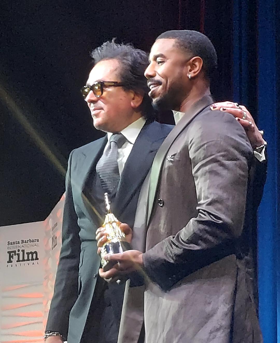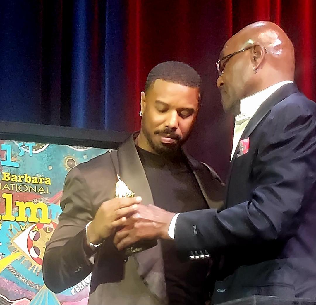 Executive Director Roger Durling Congratulates Michael B Jordan (Photo: LBN) Michael Jordan stepped on stage at the Arlington Theatre to be greeted by a full house of enthusiastic fans and his entire family, who thoroughly enjoyed his interview with Roger Durling, Executive Director of the Santa Barbara International Film Festival. Michael’s first action was to give a grateful ‘heads up’ to his lovely mother Donna Jordan, and family members Jamila Jordan and Khalid Jordan sitting in the audience. Roger Durling moderated the wonderful career history and film clips so enjoyed by the audience. The amazing film history of this exciting young actor/director is commendable, as well as his great love affair with film and the craft of acting and then directing.