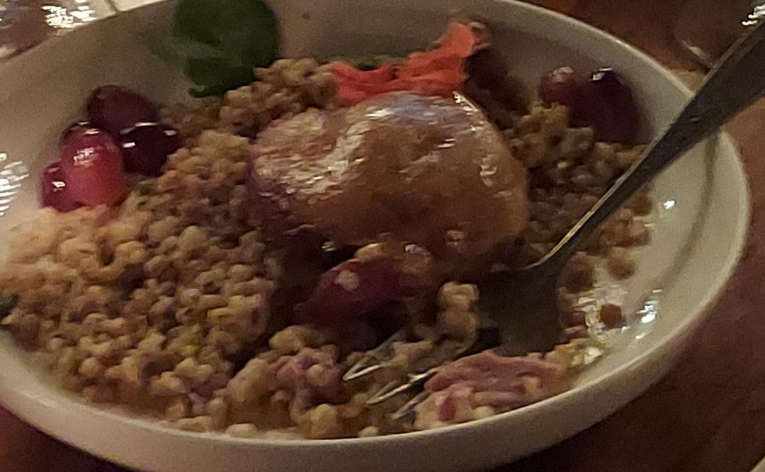 Crispy Duck Leg Confit The outstanding crispy duck leg confit was served on spring garlic barley risotto with honey roasted red flame grapes and nasturtium and was paired with a perfect sip of Yellow Spot.