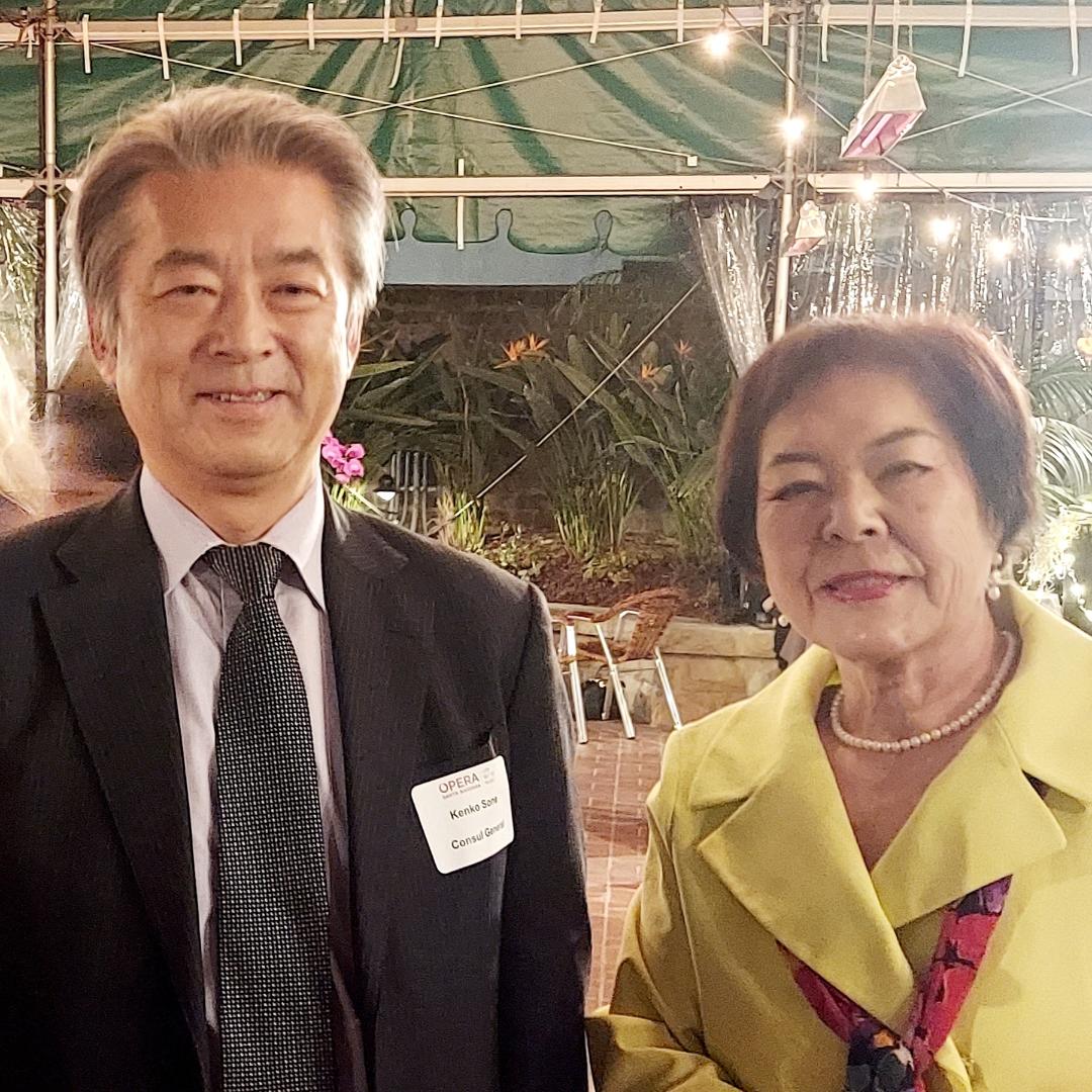 Toba Board President Takako Wakita welcomes Consul General of Japan LA Kenko Sone to 2023 An American Dream Opera celebration at Lobero Theatre in Santa Barbara Takako Wakita, who founded this organization nearly sixty years ago and served as president of the board, as well as chairwoman of the City of Santa Barbara Sister Cities Board has been the driving force behind the group’s success and popularity over the years sang one of her Japanese opera favorites. She sang with the Japanese Philharmonic Orchestra in the Dorothy Chandler Pavilion and also performed in the Opera Santa Barbara “Madam Butterfly” a few years ago, portraying the mother of Santa Barbara opera singer Gaja Hubard Kabaretti. As an active founder and member of countless area organizations, including founding member of the SBCC Japanese Language Program, her contributions to the City of Santa Barbara are awe inspiring.