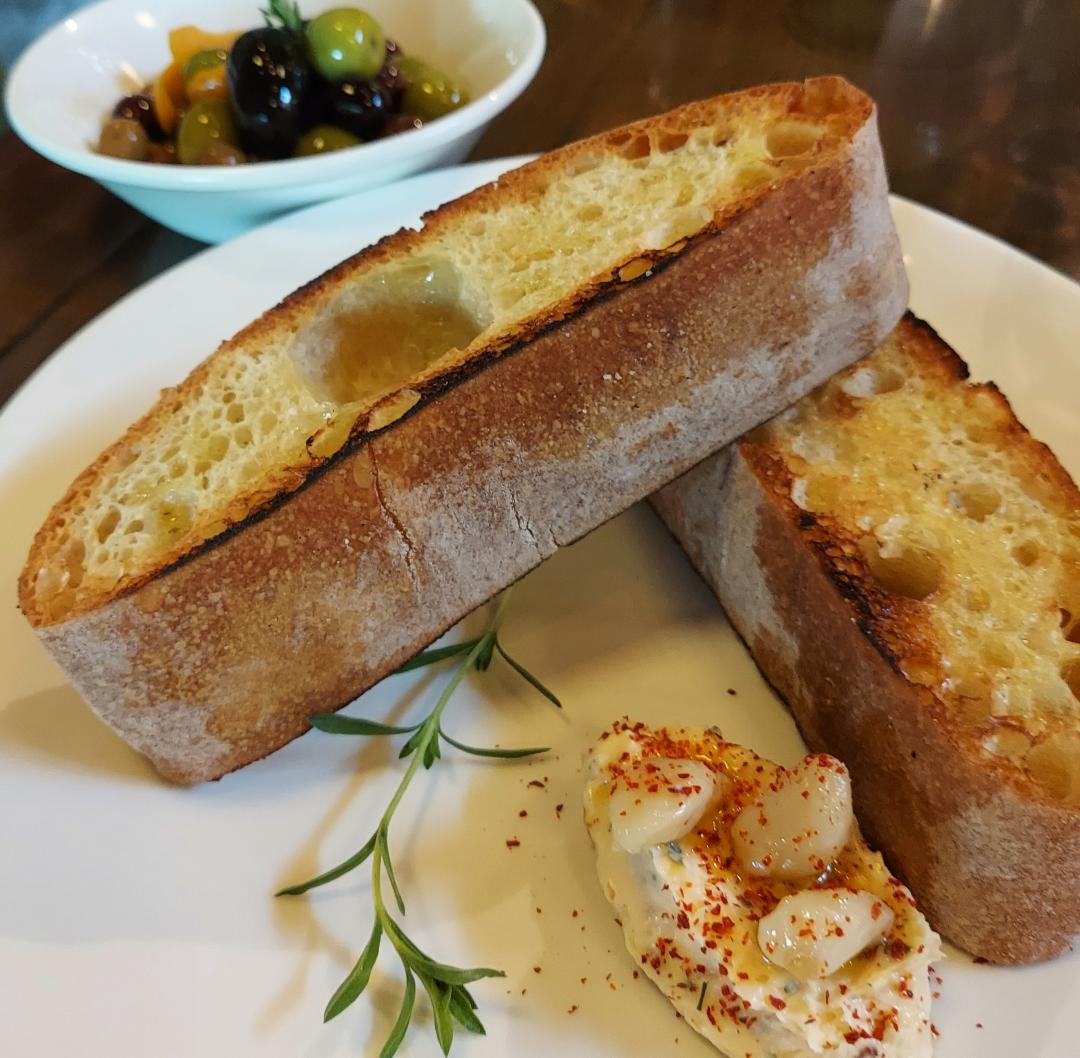 Roblar Wine Tasting Room With Tasting Bar The grounds of this historic property are country gorgeous, and include a winery comprised of an amazing and comfortable wine tasting room that is cool in summer heat and warm in cool evenings. The huge fireplace is perfect for a visit, and a cozy place to share romantic moments over a great glass of wine or have a get-to-gether with friends. Another option is the beautiful sun kissed outdoor tasting area filled with comfy seating areas and tables for groups that offers exquisite views of the vineyards and farm. It was a rather warm afternoon when I arrived, so we decided on sampling sips and bites in the cool tasting room, where the service was outstanding, and our small plates with two fine Roblar wines was perfect. I had been hearing good things about Chef Peter Cham’s field to table menus but was truly amazed by his exceptionally delicious bread & butter, warm Baker’s Table ciabatta with whipped garlic-confit butter, paired with the best tasting bowl of warm marinated olives in citrus, garlic and thyme ever with 2021 Sauvignon Blanc estate and 2021 Cuvee Blanc Estate wines.