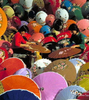 MEMORIES OF BO SANG UMBRELLA VILLAGE CHIANG MAI By Bonnie Carroll – Some exotic places you visit while traveling leave impressions in your mind and heart that never fade away. The artists at work, using coveted ancient techniques to create the renowned umbrella's at the umbrella village are one of these visions that keep returning to me whenever I am reminded of Thailand. A visit to the Bo Sang Umbrella Village, located 8 kilometers east of Chiang Mai, is a pleasant introduction to a collection of talented artisans who make and decorate the world renowned sa paper umbrellas and parasols. This is an art form that has been handed down for centuries, and today their beautiful custom painted designs can be requested for creation as souvenir gifts and trip treasures at a very reasonable price. The entrance to the umbrella-making village, and the ceiling of the center are filled with colorful umbrellas. The seven-hundred-year old city of Chiang Mai is the hub of Northern Thailand, with a population of 170,000 in the city proper and more than 1 million in the metropolitan area. It offers an abundance of greenery, is historically known as the “Rose of the North,” and is sometimes referred to as the “iron lung” of Thailand due to the lush countryside surrounded by mountains, along with the natural beauty of the region. The cosmopolitan growth in the city centers is now attracting an abundance of tourist annually, however, the basic charm of this area that is so rich in history is revered and is being preserved by proud Chiang Mai residents.