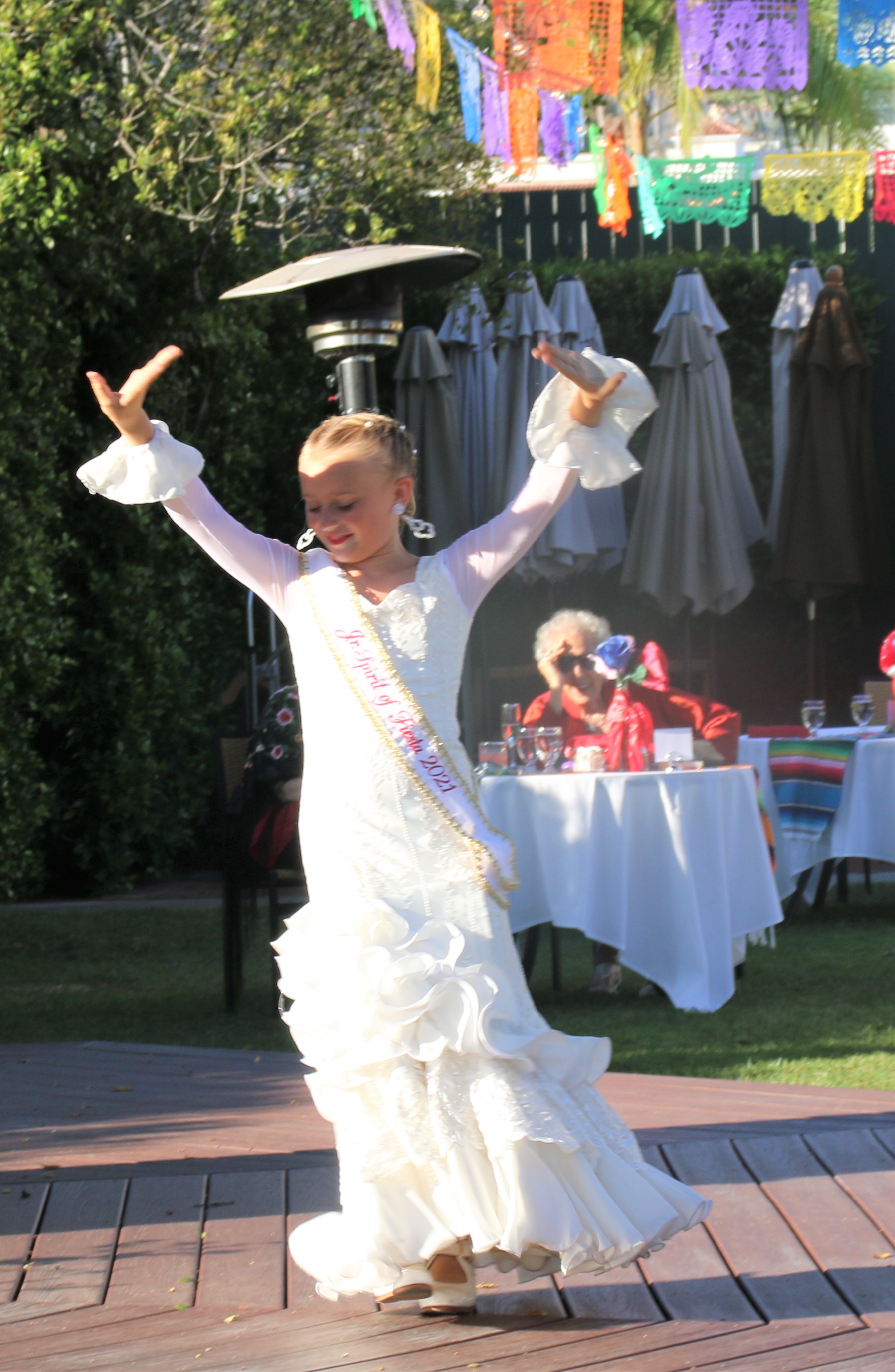2021 Spirit of Fiesta Ysabella Grace Yturralde & Jr. Spirit performing at The Santa Barbara Club The close of my busy day was to travel with David Bolton, the sweet Fiesta Spirit’s, and their dedicated parents to the Santa Barbara Club, where they gave such a beautiful and professional performance that was so appreciated by guests dining in the garden. The SBC manager treated the Spirit’s and their devoted parents to dinner, where the girls promptly removed their shoes to rest their little feet in preparation for their next performance scheduled after dinner at the SB University Club.